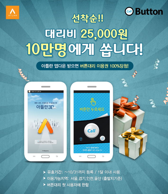 이번 이벤트는 내비게이션 앱 아틀란과 대리운전 앱 업계 1위인 버튼대리의 제휴를 기념하기 위해 마련된 이벤트로, 참가자 중 선착순 10만명에게 대리운전 1회 무료 이용권을 증정한다. 참여 방법도 간단해 구글 플레이 스토어에서 '아틀란3D'를 다운로드 받고 리뷰를 남긴 후, 이벤트 참여하기를 통해 응모하면 된다.