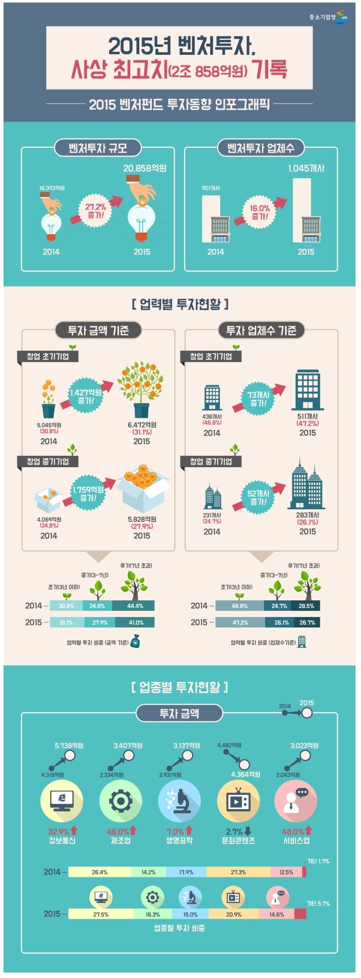 중소기업청이 발표한 벤처펀드 투자동향에 따르면 지난해 벤처투자가 2조 858억 원을 기록한 것으로 나타났다. 벤처펀드 결성액도 사상 최고치인 2조 6,260억 원을 기록했다.