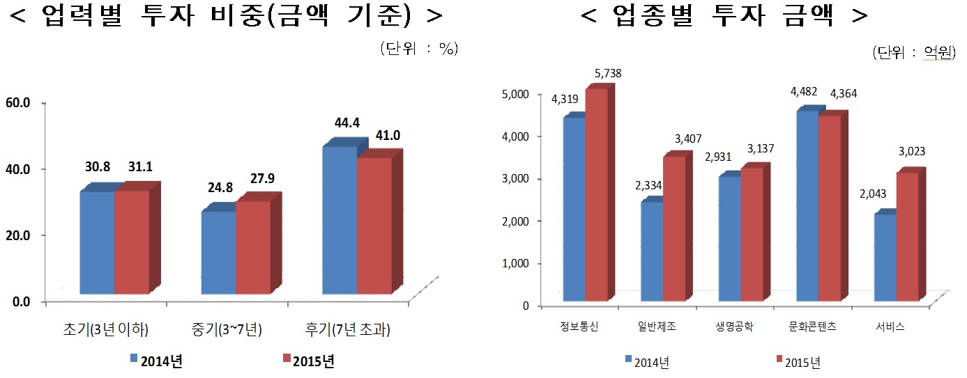 벤처 투자규모는 14년 1조 6,393억 원 대비 27.2%가 증가했고, 펀드결성액은 2조 5,842억 원 대비 1.6%가 증가한 수치다. 또한, 14년 15년 벤처펀드 출자자 중 정부기관, 산업은행, 성장사다리, 지자체 등을 제외한 민간 출자자 수가 352개에서 498개로 크게 증가했다.