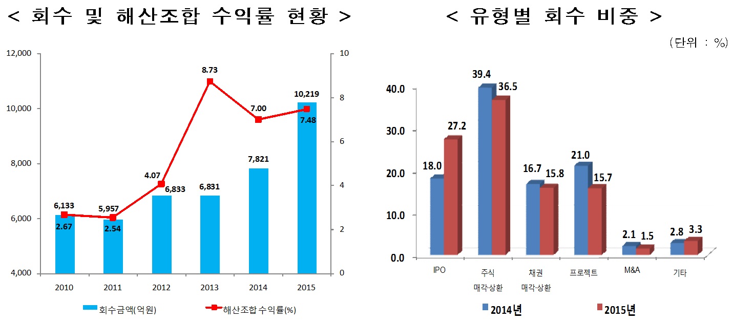벤처캐피탈이 투자자산 매각을 통해 회수한 금액은 1조 219억 원으로 전년 7,821억 원 대비 30.7% 증가했다. 해산한 조합의 연평균수익률은 7.48%로 전년 7.00% 대비 0.48% 증가했다.