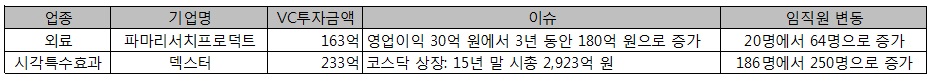 가장 많은 벤처캐피탈로부터 투자를 받은 기업은 직방과 글로벌텍스프리로 8개 벤처캐피탈로부터 각각 240억 원과, 224억 원을 투자받았고, 엑스엘게임즈가 6개 벤처캐피탈로부터 193억 원을 투자받았다.