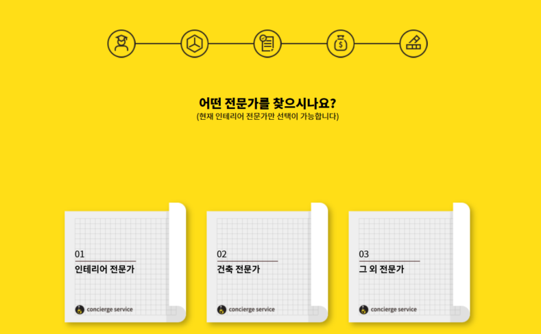 인테리어브라더스는  조건 입력 첫 단계에서 인테리어전문가, 건축 전문가 그 외의 전문가를 선택할 수 있는 데 현재는 베타서비스인 관계로 인테리어 전문가만 추천받을 수 있다.