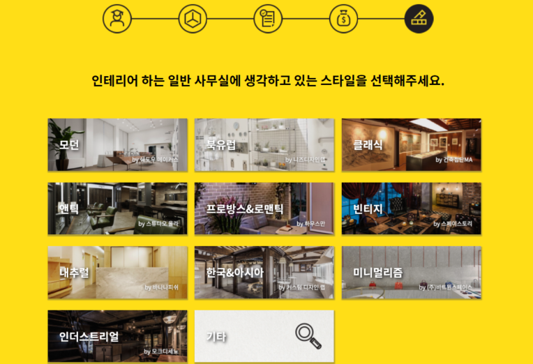 전문가를 선택하고 나면 상업, 업무, 주거 , 문화/종교 등 공간 용도를 고르고  도움을 받고 싶은 전문가 영역을 선택한다. 지원 분야는 인테리어 디자인과 시공을 포함해 공간을 채우기 위한 가구나 소품 배치를 도와주는 스타일링 등 두가지다.  인테리어 공간 면적과 예산 금액을 입력한 후 공간 스타일을 선택하면 끝.
