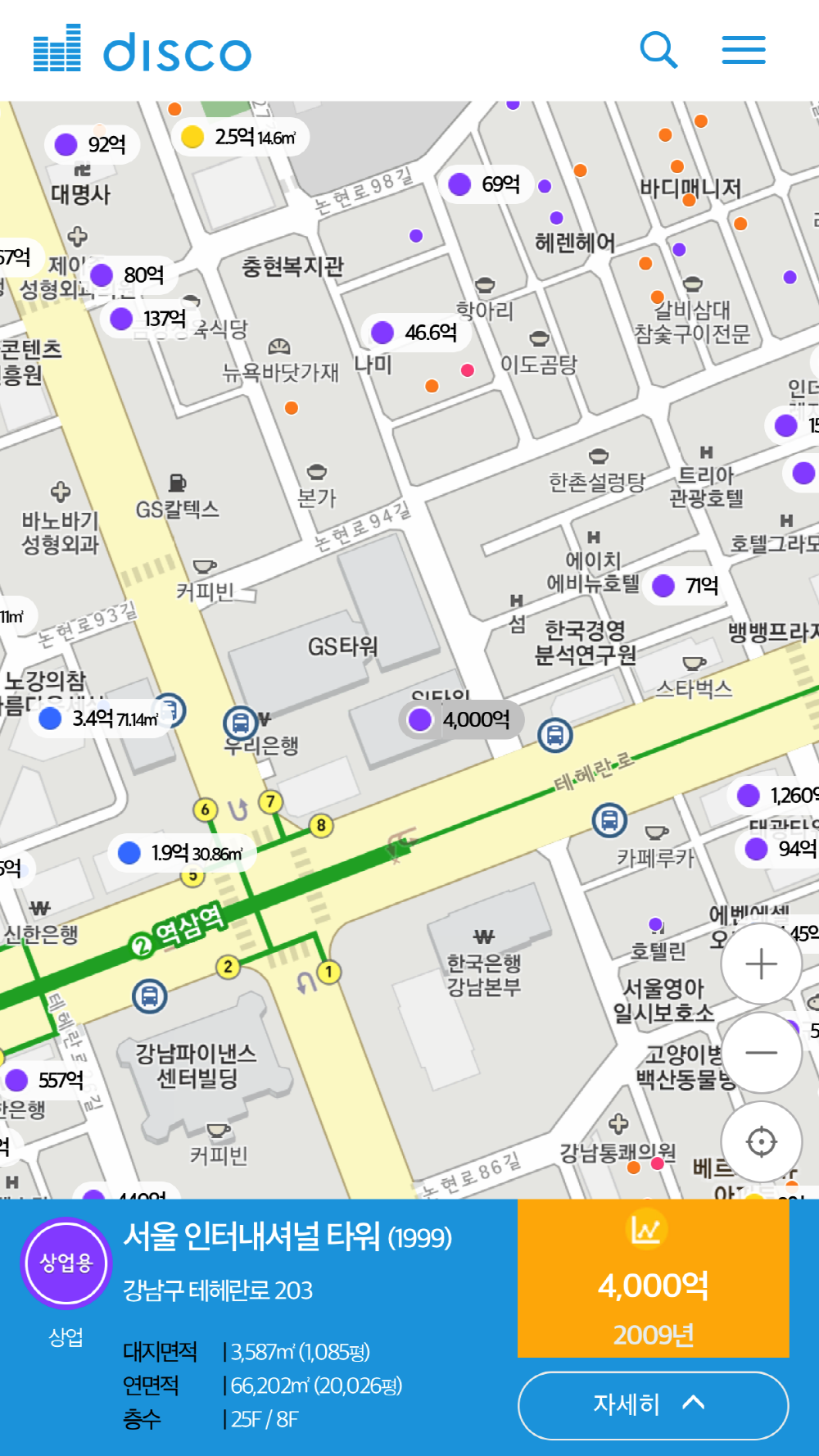 디스코의 가장 큰 특징은 전국에 있는 모든 부동산 관련 빅데이터를 제공한다는 것. 물론 베타 버전에선 실거래가가 중심이지만 다음 버전에선 모든 부동산에 대한 현재 가격을 보여줄 예정이다. 또 지도를 기반으로 한 직관적인 UI, 검색 기능을 제공하며 웹과 앱 모두 이용할 수 있다.