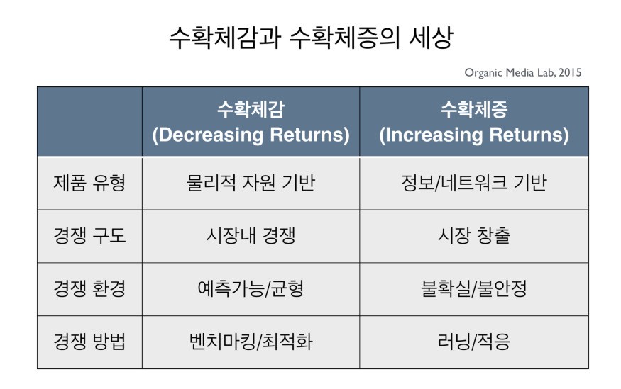 정보와 네트워크에 기반한 수확체증 세상에서의 경쟁 규칙과 방법은 물리적 자원에 기반한 수확체감 세상에서의 경쟁 규칙 및 방법과 다를 수 밖에 없다. 수확체증 세상에서의 경쟁은 시장 또는 산업 내에서의 경쟁이 아니라 새로운 시장을 창출하는 것이기 때문이다. 하지만 여전히 많은 기업들은 수확체증 세상에서 수확체감 세상의 경쟁 전략을 펼치고 있다는 점에서 문제가 발생한다.