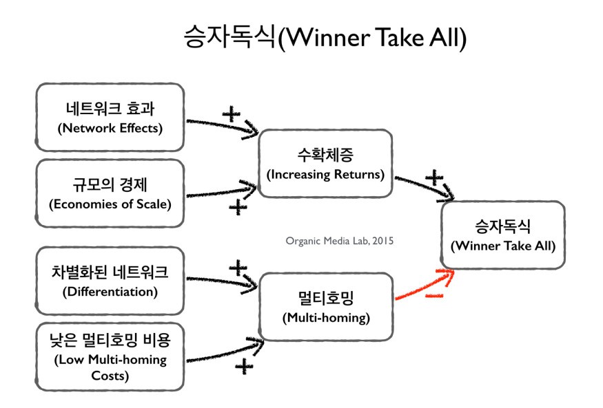 승자독식은 주어지는 것이 아니라 만들어 가는 것이다. 네트워크 효과와 규모의 경제에 기반한 선순환 구조를 만들고, 멀티호밍의 필요성을 낮춤으로서 승자독식으로 진화하는 것이다.
