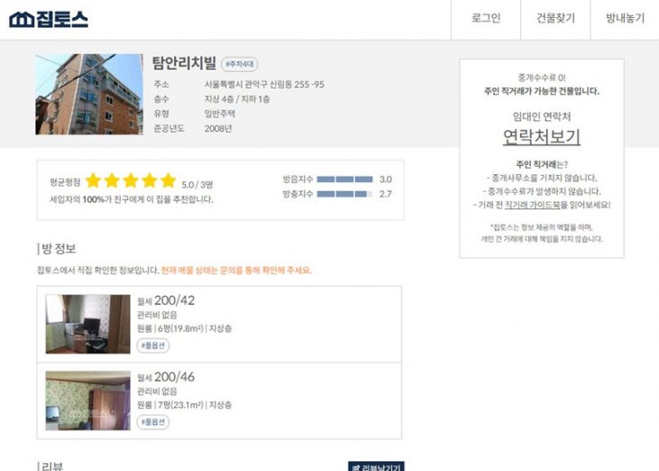 또한, 집토스는 온라인 사이트를 통해 기존 세입자의 거주 후기와 전월세 과거 임대가격 가격, 직접 확인한 매물 정보를 건물별로 모아서 제공한다.