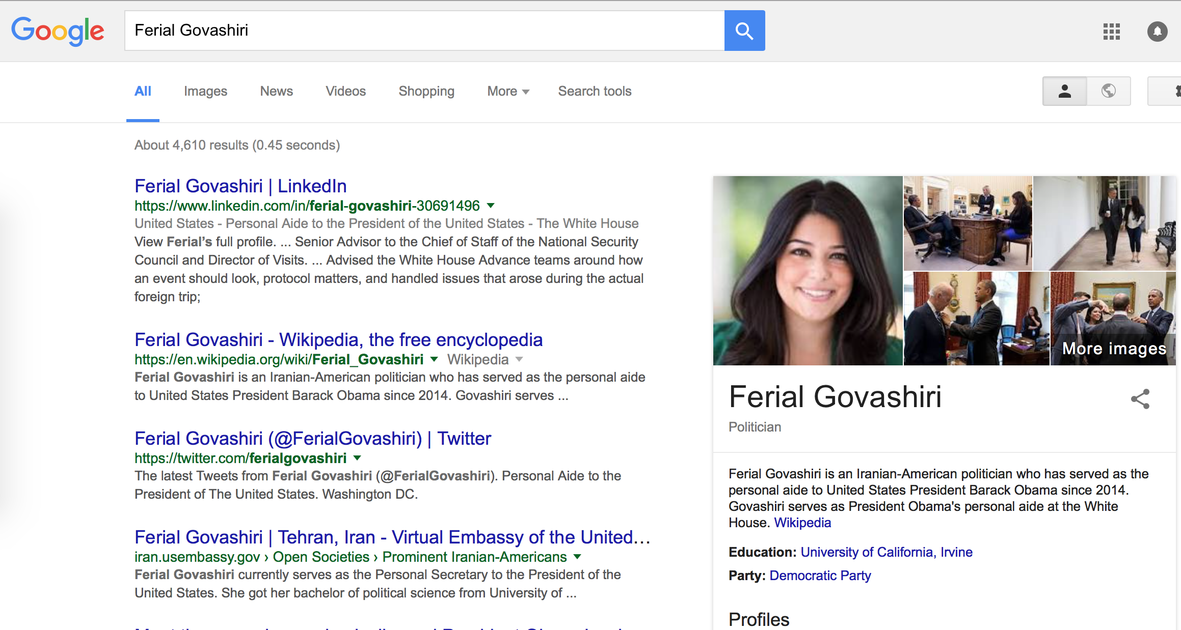 사진설명에 옆에 앉아있는 비서의 실명이 나와있다. Ferial Govashiri다. 구글링해보니 링크드인프로필, 위키피디아, 트위터프로필이 차례대로 나온다. 놀랍게도 파시(페르시아어)에 능통한 이란계 여성이다.