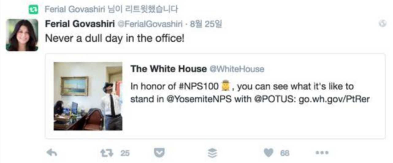 Ferial은 트윗도 열심히 한다. 자신이 나온 오바마의 VR사진을 리트윗하며 “Never a dull day in the office!”라고 썼다. 정말 지루할 틈이 없겠다.