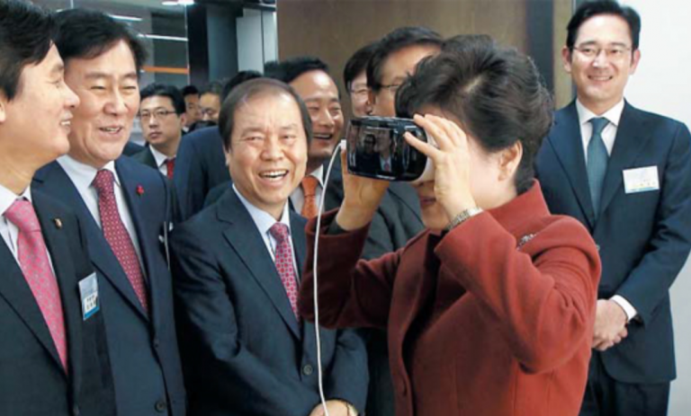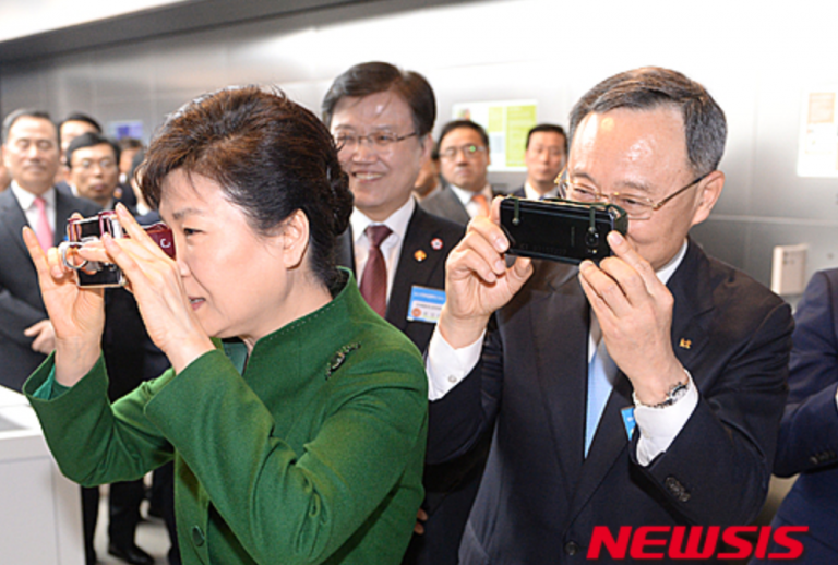 박 대통령의 VR체험사진은 이미 두 번이나 공개됐다. 한 번은 위는 판교 스타트업 캠퍼스 개소식에서 아래는 경북창조경제혁신센터 개소식에서 공개된 사진이다.