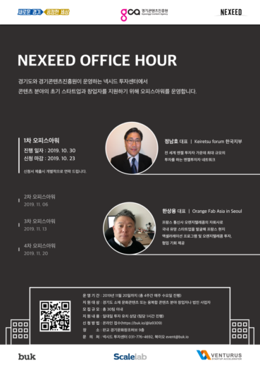 넥시드 오피스아워는 경기도 소재 콘텐츠 창업자와 초기 스타트업을 지원하는 프로그램. 문화 콘텐츠와 융복합 콘텐츠 분야 스타트업이라면 누구나 신청할 수 있다. 10월 31∼11월 20일까지 4주간 매주 수요일 오후에 진행하며 투자 전문가 10명과 스타트업 30곳이 투자 상담을 실시할 예정.