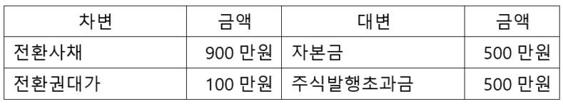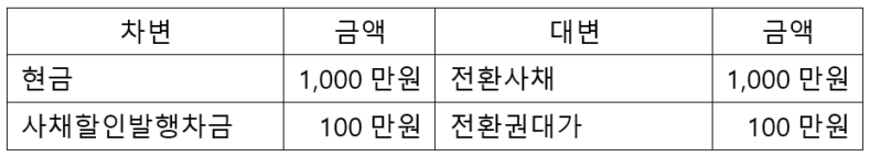 예를 들어, 전환사채 발행금액이 1,000만원이고, 부채 요소 금액이 900만원, 자본 요소 금액이 100만원이라면, 발행일에 다음과 같이 회계처리 될 것이다.