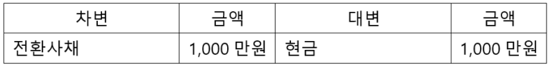 전환사채가 상환될 때는 부채요소가 소멸되며, 자본요소인 전환권대가는 변동하지 않는다. 예를 들어, 상환당시 부채요소 장부금액이 1000만원이라면, 다음과 같이 회계처리 될 것이다.