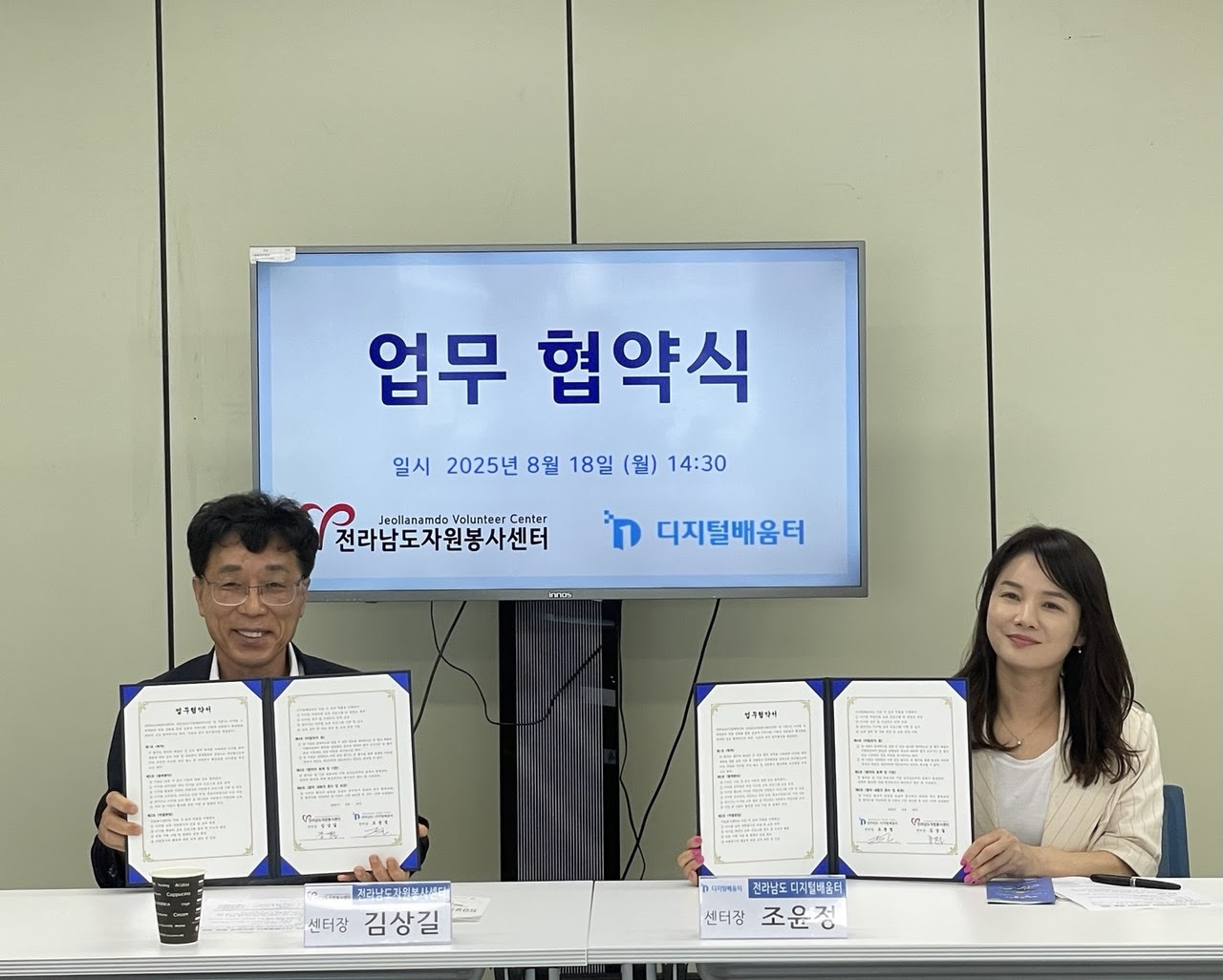 전라남도자원봉사센터(센터장 김상길)와 디지털 배움터(센터장 조윤정)는 지난 18일 전남자원봉사센터 회의실에서 업무협약(MOU)을 체결하고, 도내 디지털 취약계층의 역량 강화와 자원봉사 활성화를 위한 협력체계를 구축하기로 했다.