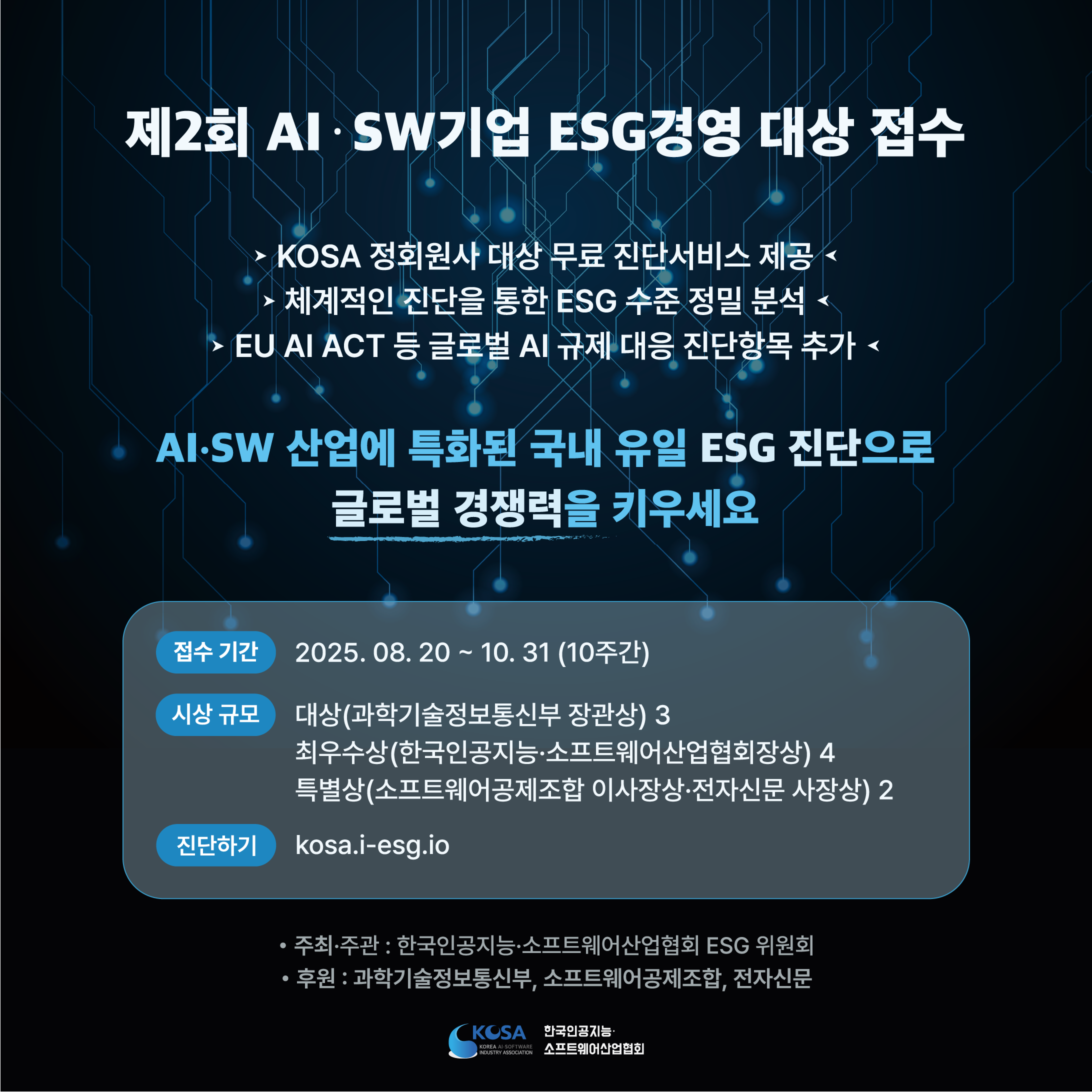 행사는 한국인공지능·소프트웨어산업협회 산하 ESG위원회가 주최·주관하고, 과학기술정보통신부와 소프트웨어공제조합, 전자신문이 후원한다. 시상식은 12월 17일 ‘2025 KOSA 회원의밤’ 행사에서 개최된다.