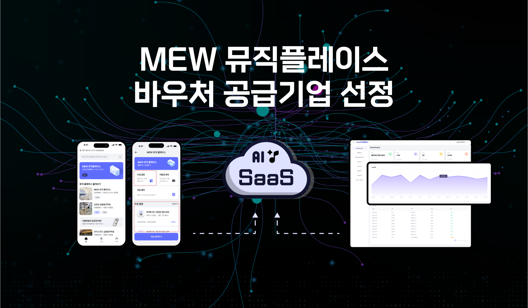 MEW 뮤직 플레이스는 음악교육 기관의 운영 전반을 디지털화할 수 있는 플랫폼으로, ▲온·오프라인 결제 및 비대면 수납 기능 ▲매출·강사·수강생·시설 관리 기능 ▲학습 콘텐츠 기반 커리큘럼 관리 시스템 ▲학생·학부모·강사용 전용 앱 제공 등의 기능을 포함하고 있다.