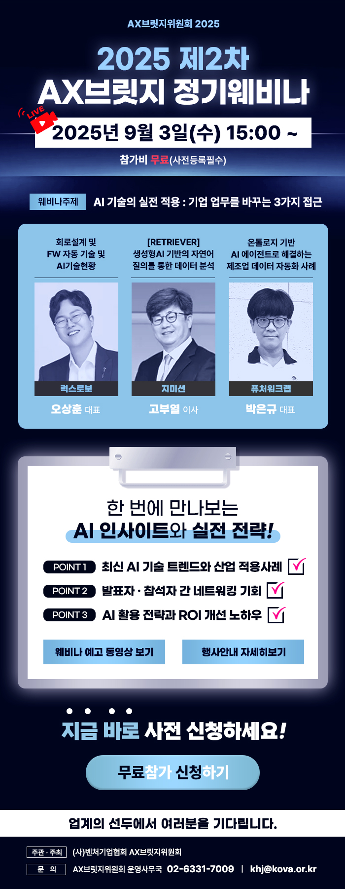 벤처기업협회(회장 송병준) 산하 AX브릿지위원회(위원장 이주완 메가존클라우드 의장)는 9월 3일(수) 오후 3시 ‘2025 제2차 AX브릿지 정기웨비나’를 개최한다고 밝혔다.