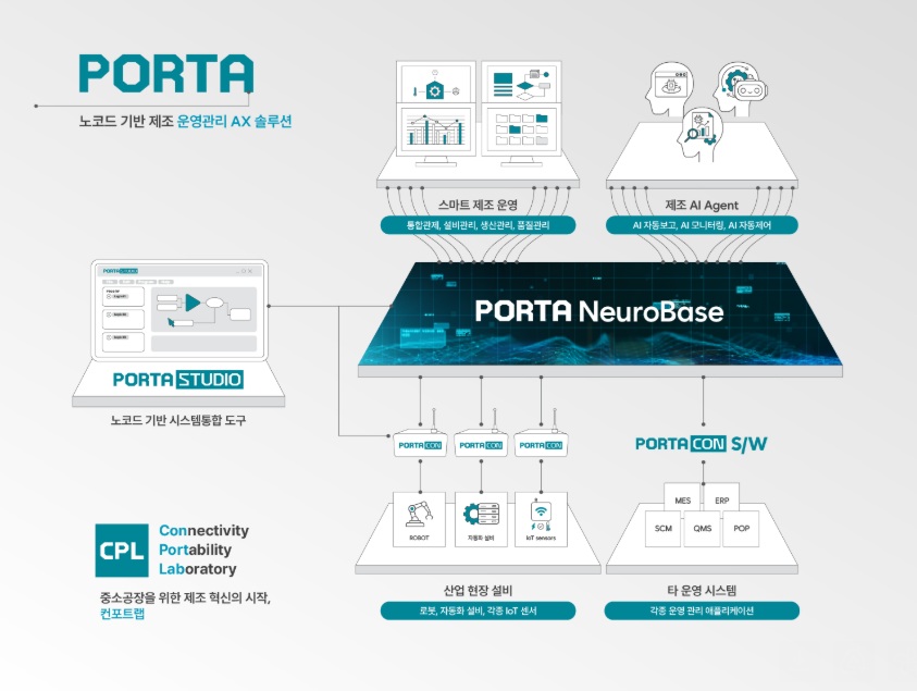 컨포트랩의 핵심 제품은 노코드 기반 AX 플랫폼인 ‘포타(PORTA)’다. 이 플랫폼은 ▲설비·센서 데이터 수집 장비 ‘포타콘(PortaCON)’ ▲실시간 통합 분석 엔진 ‘포타 뉴로베이스(PORTA Neurobase)’ ▲노코드 개발 도구 ‘포타 스튜디오(PORTA STUDIO)’ ▲AI 기반 제조 운영관리 시스템 ‘포타 앱(PORTA Apps)’으로 구성된다. 기존 대비 구축 기간과 비용을 크게 절감할 수 있어, 다양한 규모의 제조 기업에 적용되고 있다.