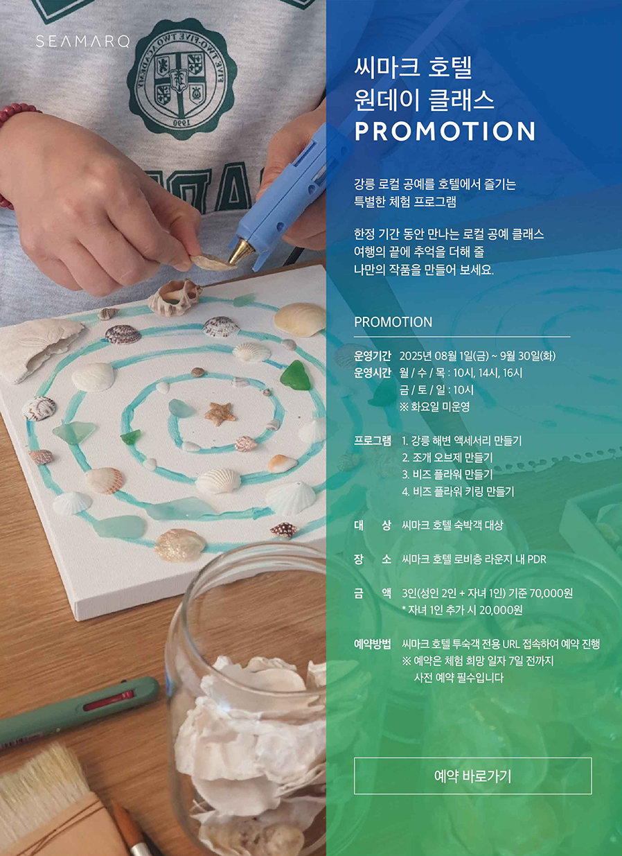 이번 협약으로 씨마크호텔은 8월 1일부터 9월 30일까지 2개월간 투숙객 대상 공예 원데이클래스를 시범 운영한다. 강릉 해변 액세서리 만들기, 조개 캔버스 만들기 등 다양한 프로그램이 제공될 예정이며, 시범 운영 성과에 따라 공예 프로그램 확대를 검토할 계획이다.