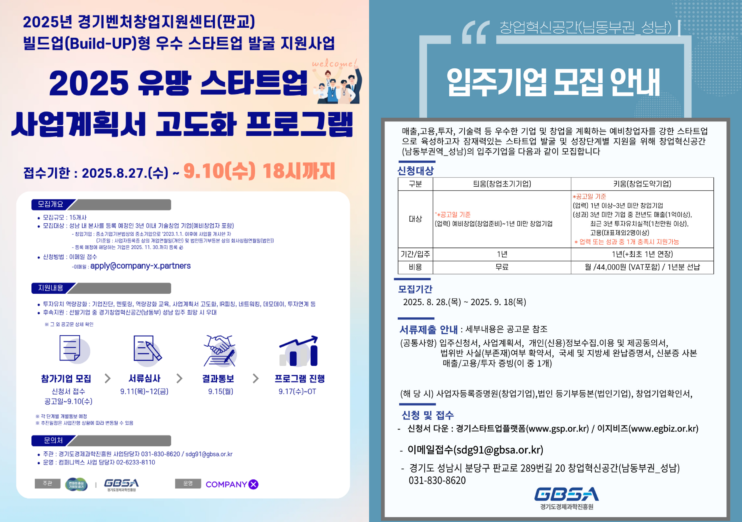 Hosted by the Gyeonggi Province Economic and Science Promotion Agency, the "2025 Gyeonggi Venture and Startup Support Center (Pangyo) Build-up-Type Excellent Startup Discovery and Cultivation Support Project" is recruiting a total of 15 companies. The application deadline is 6:00 PM on Wednesday, September 10, 2025. Interested companies can check the details and apply online at the Gyeonggi Startup Platform (https://www.gsp.or.kr/). The Gyeonggi Startup Platform is a startup support hub that provides comprehensive support to startups in Gyeonggi Province, including investment connections, expert advice, project matching, and space and facility provision.