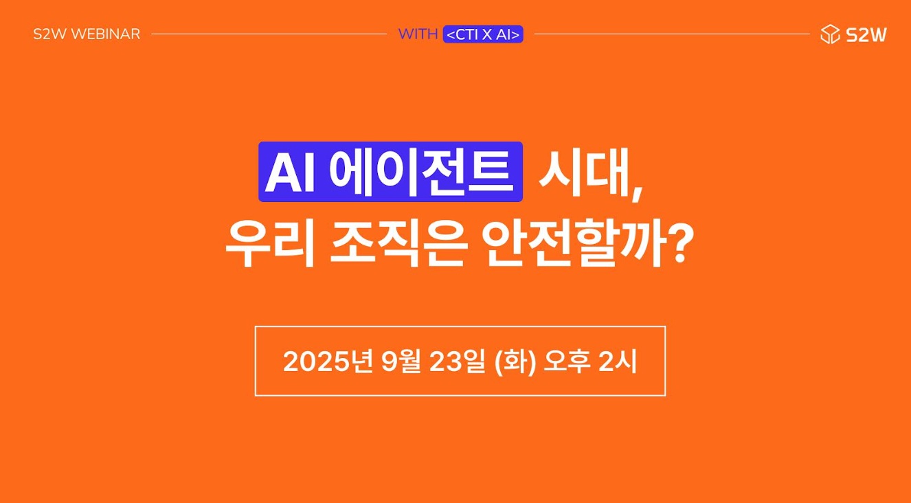 이번 웨비나는 ‘AI 에이전트 시대, 우리 조직은 안전할까?’를 주제로 진행되며, S2W의 기술 웨비나 시리즈 ‘위드(WITH)’의 일환으로 마련됐다. 오후 2시부터 실시간으로 진행되는 이번 행사에서는 ▲AI 에이전트 및 멀티 에이전트 시스템의 구조와 작동 방식 ▲AI 시스템에서 발생 가능한 주요 보안 취약점 및 실제 위협 사례 ▲조직 내 실무 적용을 위한 보안 대응 전략 등이 다뤄질 예정이다.