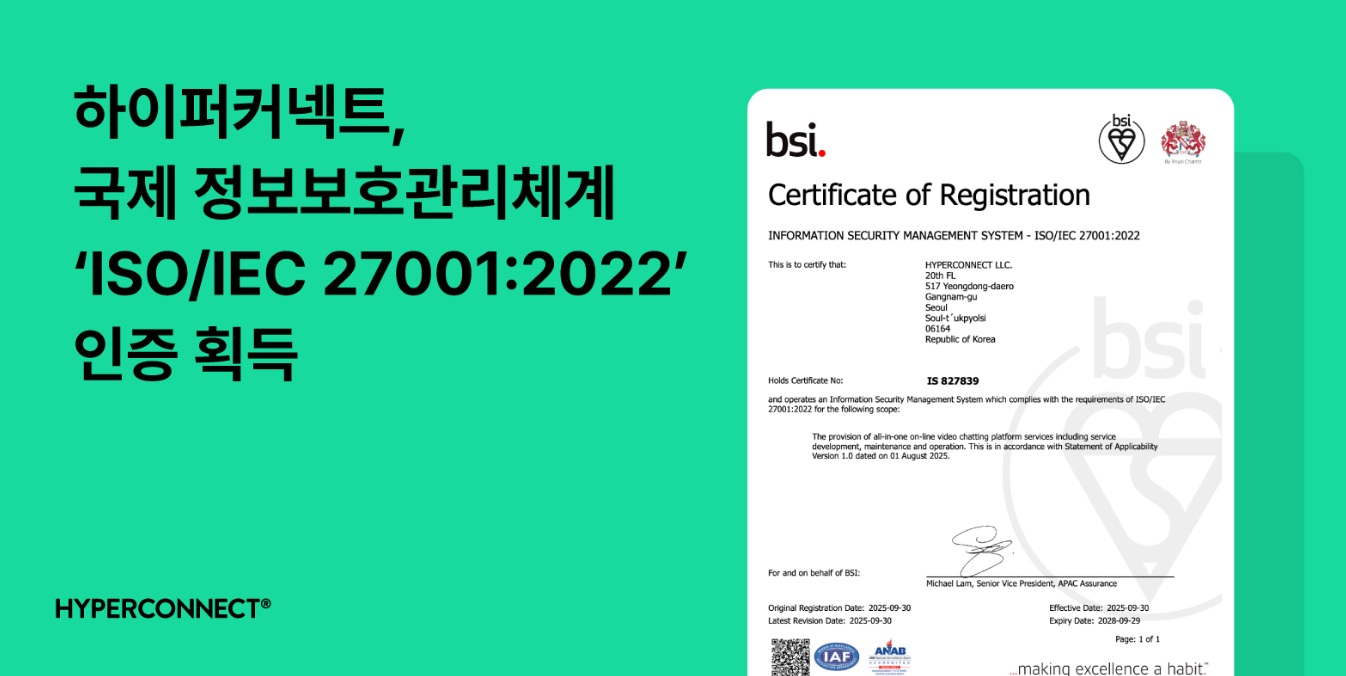 하이퍼커넥트 김민주 CISO(Chief Information Security Officer)는 “이번 인증은 당사의 정보보호 관리 역량이 국제 기준과 부합함을 공식적으로 인정받았다는 점에서 의미가 매우 크다”며, “앞으로도 지속적인 개선과 투자를 통해 보안 역량을 글로벌 스탠다드 수준으로 유지하겠다”고 밝혔다.