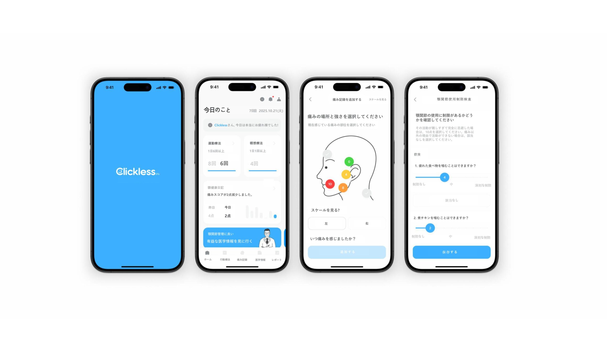 ‘클릭리스’는 인지행동치료(CBT)에 기반해 턱관절 장애 환자가 일상 속에서 생활 습관을 교정하고 자가 관리할 수 있도록 설계된 디지털 치료 솔루션이다. 별도의 웨어러블 장비 없이 스마트폰 카메라만으로 작동하며, 환자는 치료 과정을 일상 속에서 진행하고, 의료진은 클라우드 기반 플랫폼을 통해 치료 데이터를 실시간으로 확인하고 맞춤형 치료 계획을 제시할 수 있다.