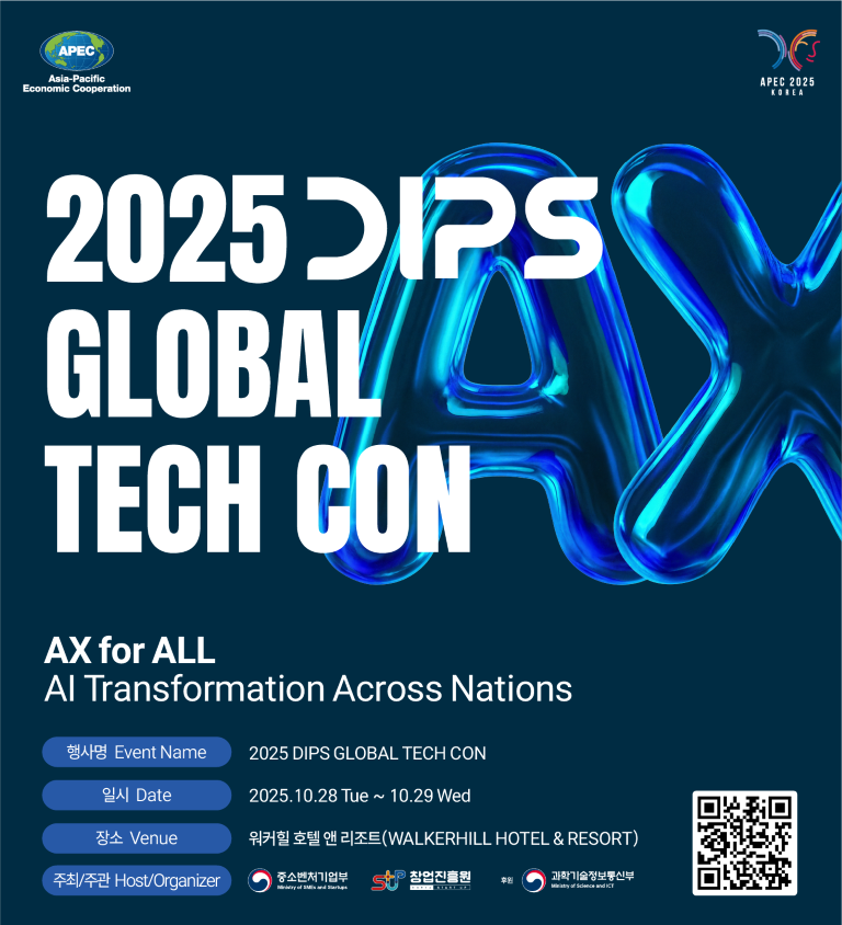 ‘DIPS 2025 GLOBAL TECH-CON’은 중소벤처기업부(장관 한성숙)와 창업진흥원(KISED, 원장 유종필)이 주최·주관하는 초격차 스타트업 1000+ 프로젝트의 연간 대표 행사로, 10월 28일부터 29일까지 이틀간 워커힐 호텔에서 진행된다. 컨퍼런스, 전시, 밋업 등 다양한 프로그램이 마련됐으며, 이 중 테크팝업 AX는 ‘AX for ALL : AI Transformation Across Nations’를 주제로 열려 심사를 통해 선정된 혁신 스타트업 10개사가 참가한다.