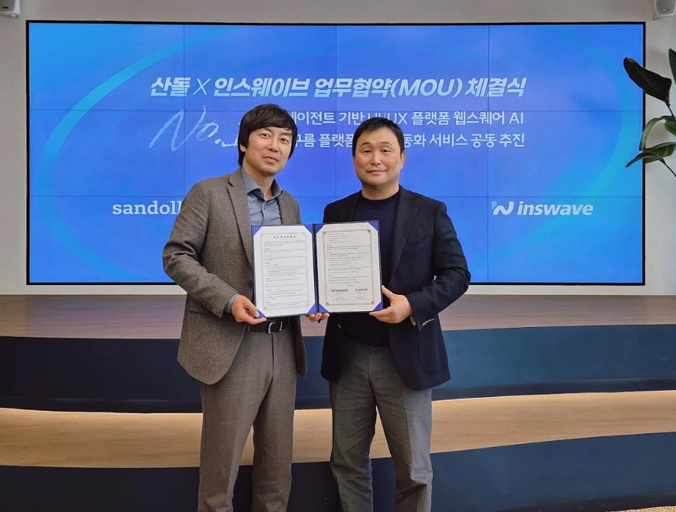 콘텐츠 크리에이터 기업 산돌(대표 윤영호)과 디지털 경험 플랫폼 기업 인스웨이브(대표 어세룡)가 AI와 폰트를 결합한 차세대 UX 자동화 서비스 개발을 위한 업무협약(MOU)을 체결했다고 29일 밝혔다. 협약식은 28일 서울 여의도 인스웨이브 본사에서 열렸으며, 양사 대표와 임원진이 참석했다.