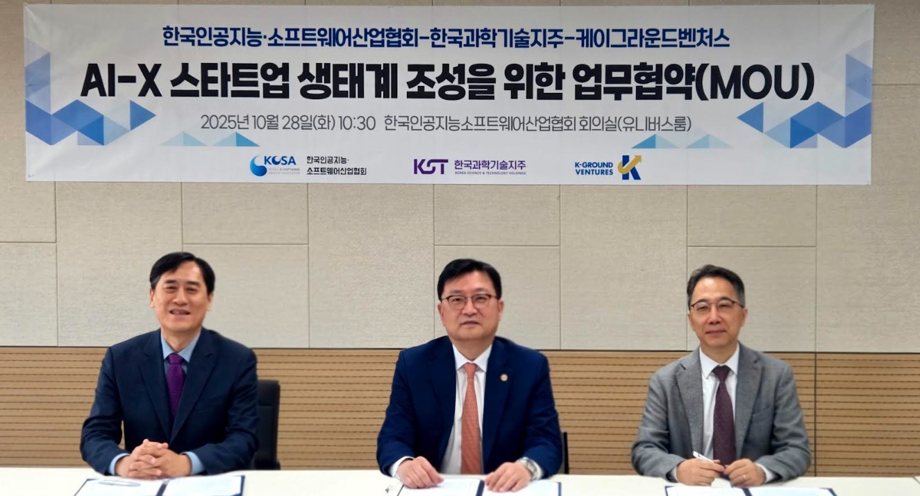 한국인공지능·소프트웨어산업협회(KOSA, 회장 조준희)는 10월 28일 서울 송파구 협회 본원에서 한국과학기술지주(KST, 대표 최치호), 케이그라운드벤처스(KGV, 대표 조남훈)와 ‘AI 스타트업 생태계 활성화를 위한 상호협력 업무협약(MOU)’을 체결했다.