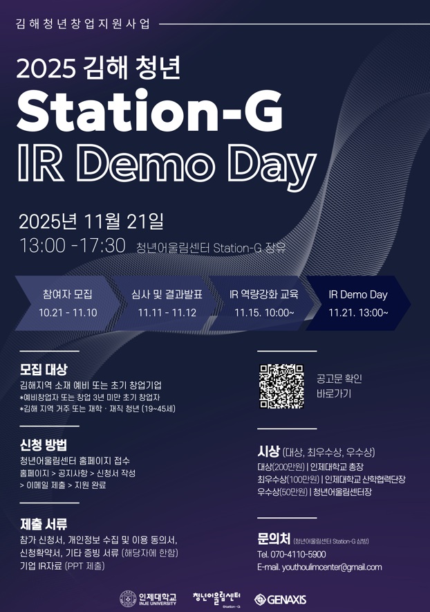 김해 지역 청년 창업자의 성장과 투자유치 역량 강화를 위한 ‘2025 김해 청년 Station-G IR Demo Day’ 참가기업 모집이 시작됐다. 이번 프로그램은 인제대학교 산학협력단과 청년어울림센터 Station-G가 주관하고, 액셀러레이터 젠엑시스가 운영한다.