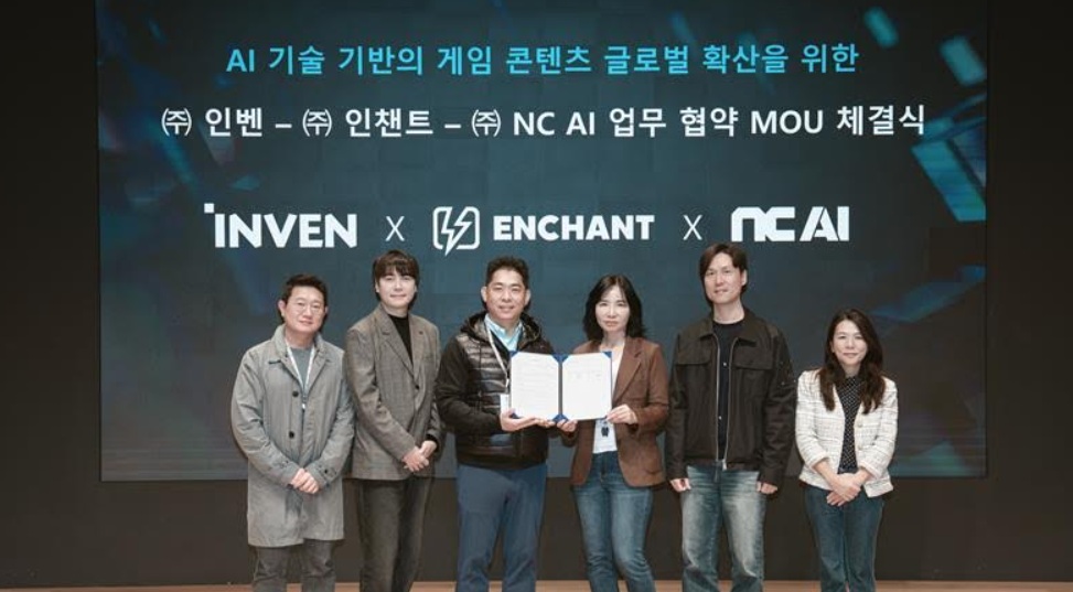 NC AI가 게임 전문 미디어 플랫폼 인벤, 게임 전문 MCN 기업 인챈트 엔터테인먼트와 AI 기반 게임 콘텐츠 글로벌 확산을 위한 업무협약(MOU)을 체결했다고 5일 밝혔다. 협약식은 경기도 성남 판교 NC AI 본사에서 NC AI 이연수 대표, 인벤 박규상 대표, 인챈트 김민기 이사가 참석한 가운데 진행됐다.