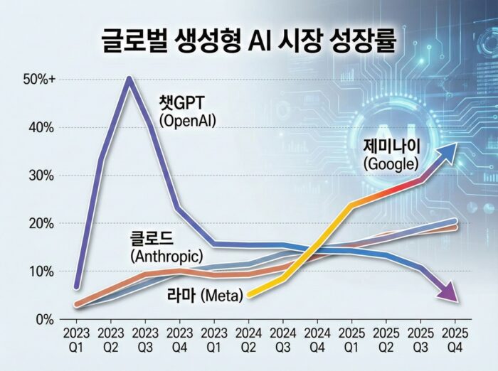 챗GPT 성장 둔화와 생성형 AI 경쟁 심화가 동시에 진행되면서 글로벌 생성형 AI 시장이 ‘2막’에 접어들었다는 평가가 나온다. 선도주자였던 오픈AI는 여전히 막강한 사용자 기반을 유지하고 있지만, 구글, 앤스로픽, 메타 등 경쟁사의 추격 속에 성장 속도와 시장 지배력 관리라는 이중 과제에 직면했다.