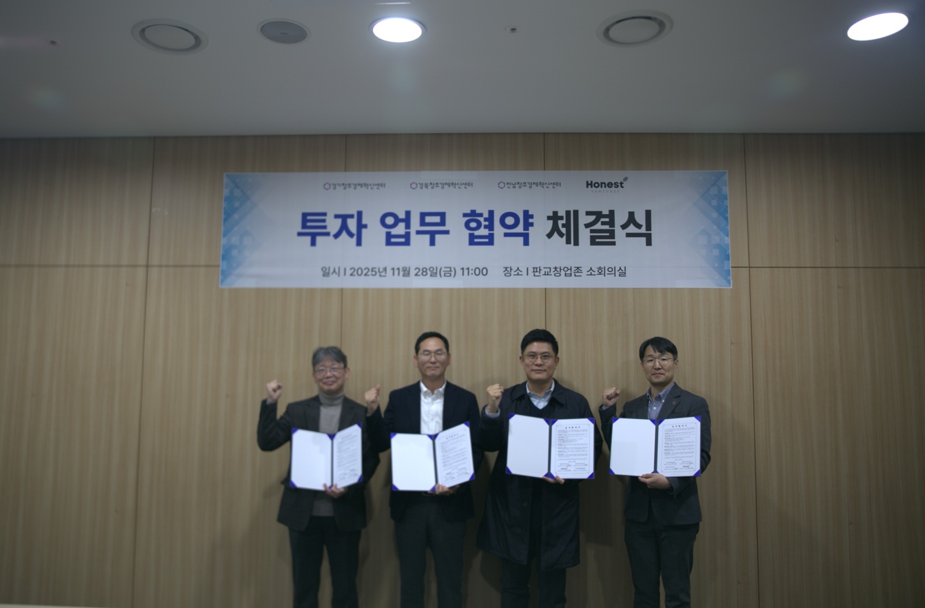 Le Centre de Gyeonggi pour l'économie créative et l'innovation (dirigé par Won-kyung Kim, ci-après dénommé Centre d'innovation de Gyeonggi), en collaboration avec le Centre de Gyeongbuk pour l'économie créative et l'innovation, le Centre de Jeonnam pour l'économie créative et l'innovation et Honest Ventures, a signé le 28, au sein de la zone de startups de Pangyo, un protocole d'accord quadripartite visant à soutenir la détection, l'investissement et l'incubation de jeunes entreprises. Cet accord a pour objectif de consolider les capacités d'investissement de l'écosystème local des startups et de jeter les bases d'un accompagnement intégré tout au long du processus de croissance des entreprises en phase d'amorçage.