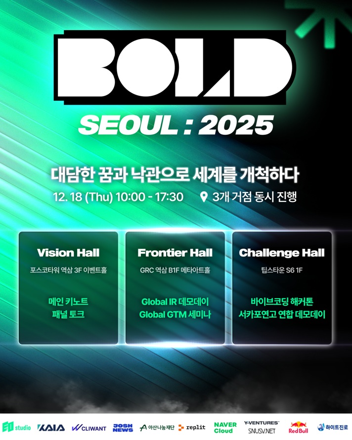 (사)초기투자액셀러레이터협회(KAIA, 협회장 전화성)와 이오스튜디오(EO, 대표 김태용)는 ‘BOLD Seoul 2025 컨퍼런스’를 오는 12월 18일 역삼역 인근 3개 거점에서 개최한다고 10일 밝혔다. 이번 행사는 “대담한 꿈과 낙관으로 세계를 개척하다”를 슬로건으로, 한국 창업가들이 글로벌 시장에서 성장할 수 있도록 실전 중심의 인사이트와 네트워크를 제공하기 위해 마련됐다.