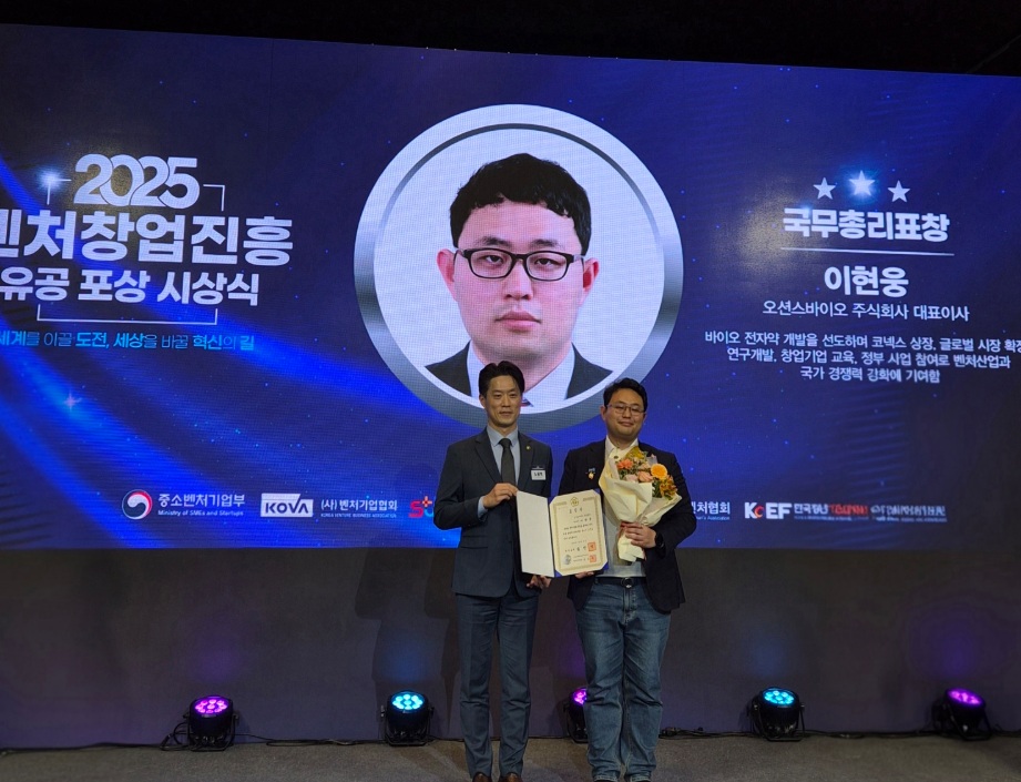 전자약 전문기업 오션스바이오㈜는 벤처기업협회가 주관한 ‘2025 벤처창업진흥 유공 포상’ 시상식에서 ‘벤처기업 활성화’ 공로를 인정받아 국무총리상을 수상했다고 12일 밝혔다. 벤처기업협회는 벤처 창업 활성화를 통한 산업 혁신을 독려하기 위해 이번 포상을 마련했으며, 전략적 핵심기술 개발, 시장 개척, 신기술 도입 등에서 우수한 성과를 보인 10개 기업을 선정했다.
