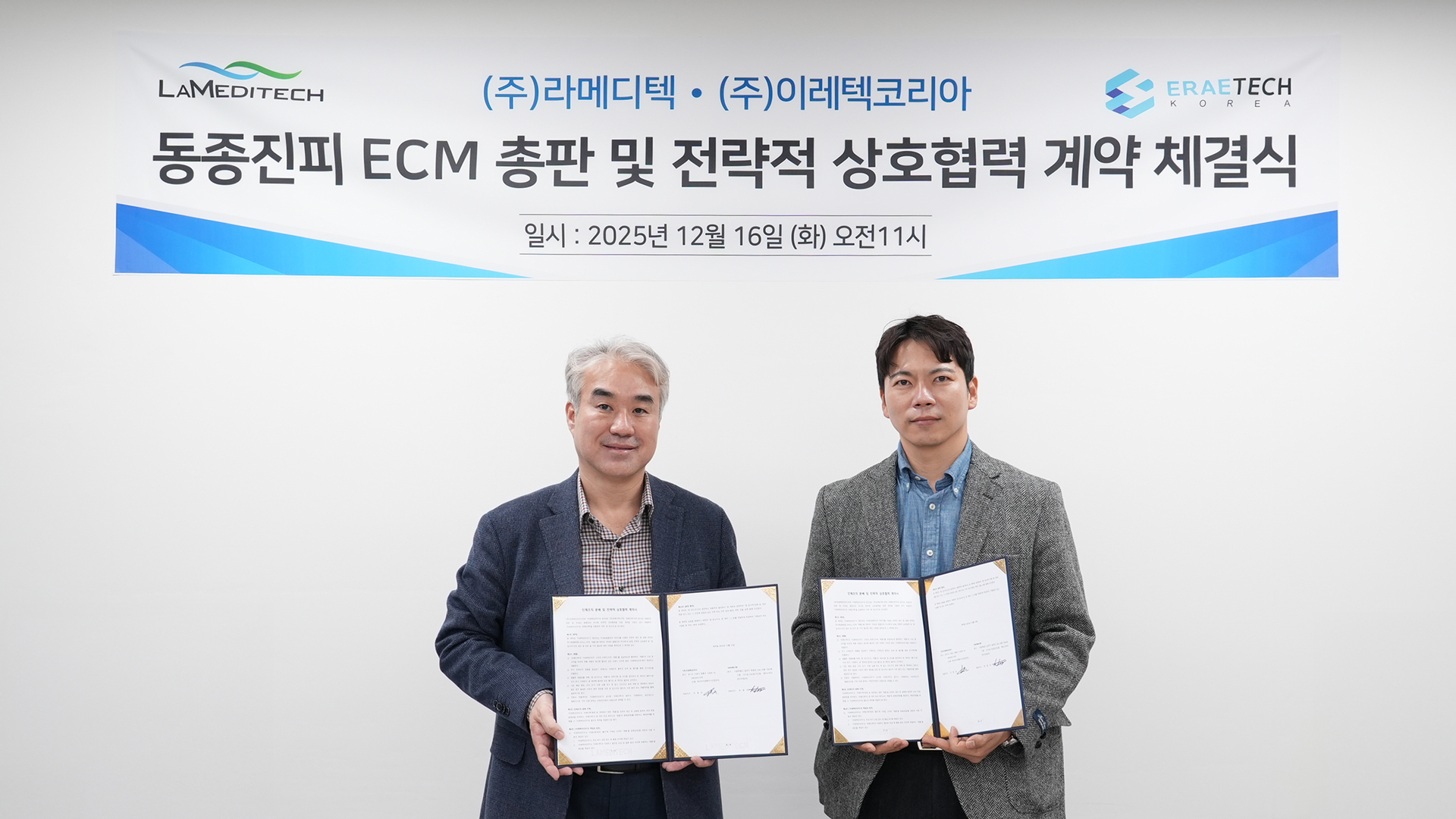 Lameditech Co., Ltd., a laser healthcare specialist, announced on the 17th that it has signed a domestic distribution and strategic cooperation agreement for acellular allograft dermis (ECM, Extra Cellular Matrix) products with Iretech Korea Co., Ltd., a regenerative medical biomaterial specialist.