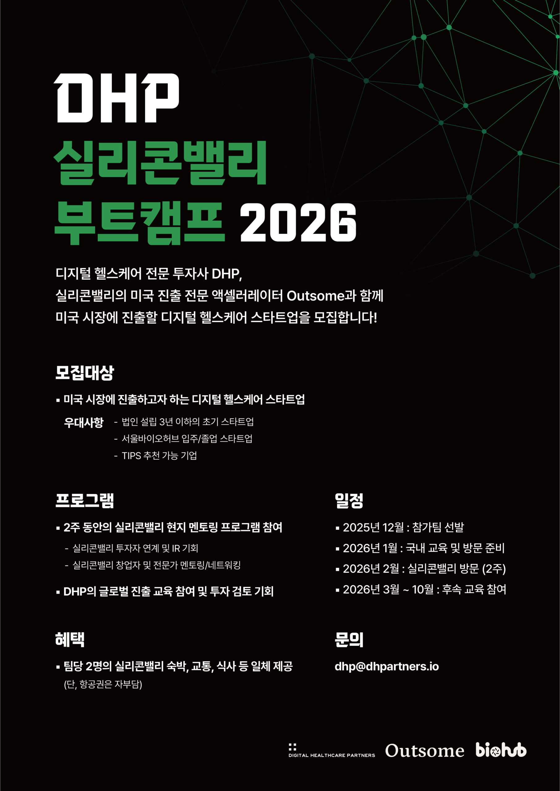 참가 기업은 교육과 네트워킹뿐만 아니라, 숙박·교통·식사 등 현지 체류 비용이 무료로 제공되며(항공권 제외), DHP는 참여 기업 중 2개 이상에 직접 투자를 집행할 계획이다. 우수 기업에게는 팁스(TIPS) 추천과 DHP 2026 데모데이 발표 기회도 제공된다.