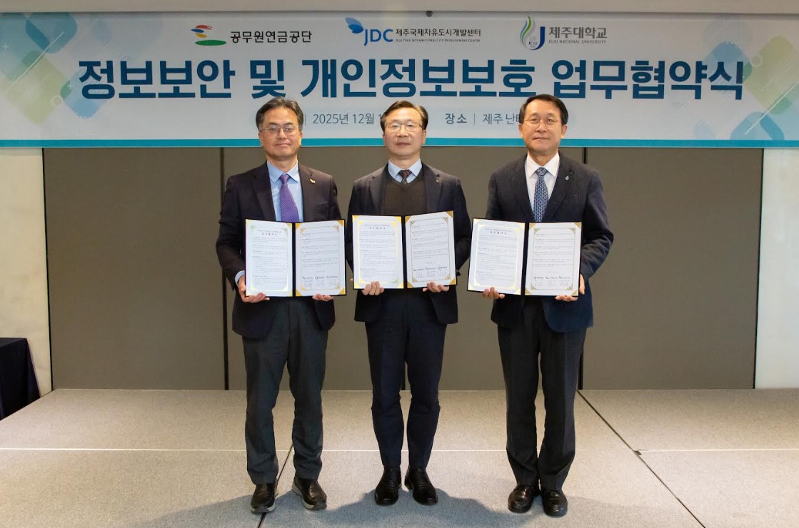 제주국제자유도시개발센터는 12월 18일 공무원연금공단, 제주대학교와 함께 제주 지역 유관기관 간 정보보안 및 개인정보보호 분야 협력 강화를 위한 업무협약을 체결했다고 밝혔다. 이번 협약은 각 기관이 보유한 보안 역량을 연계해 사이버 위협 대응 수준을 체계적으로 강화하기 위해 마련됐다.