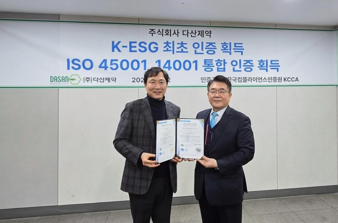 Dasan Pharmaceutical Co., Ltd. (CEO Ryu Hyeong-seon), a specialized pharmaceutical CDMO company, announced on the 6th that it has obtained ESG certification and ISO 45001/14001 integrated certification to strengthen its sustainable management competitiveness across safety, environment, and governance.