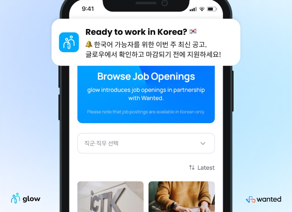 글로우 앱과 웹 사용자들은 원티드랩이 보유한 채용 공고를 실시간으로 확인할 수 있으며, 특히 개발, 기획, 데이터 등 IT 직군 중심의 공고가 API 방식으로 글로우 플랫폼에 맞춤 제공된다. 외국인 구직자는 별도의 검색 없이 앱 내에서 지원할 수 있어 편의성이 향상될 전망이다.