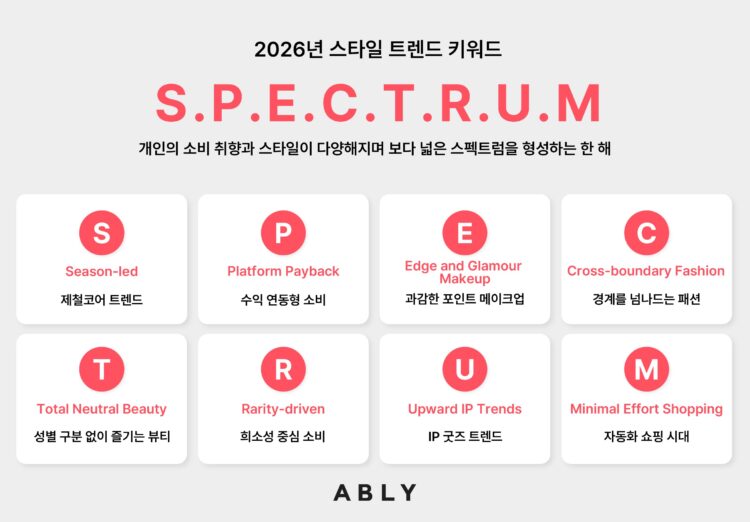 에이블리코퍼레이션(대표 강석훈)이 운영하는 스타일 커머스 플랫폼 에이블리는 2026년 스타일 트렌드로 ‘S.P.E.C.T.R.U.M(스펙트럼)’을 선정했다고 14일 밝혔다. 개인의 소비 취향과 스타일이 다양해지며, 보다 넓은 스펙트럼을 형성하는 한 해를 예고하는 동시에, 에이블리가 그 중심에서 혁신을 주도하겠다는 목표를 담았다.