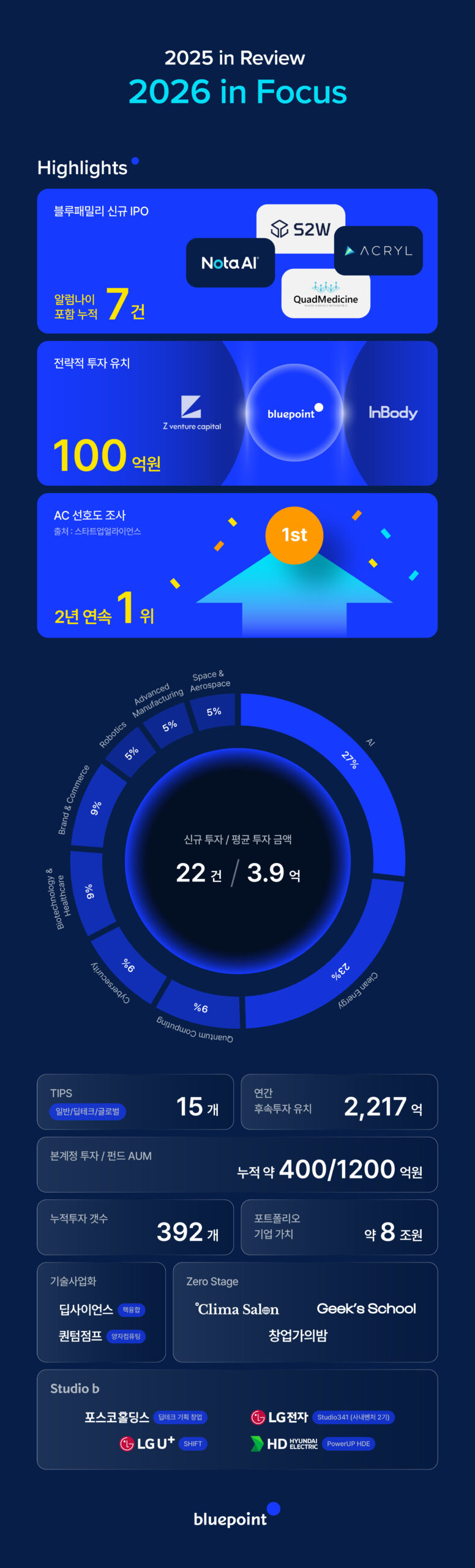 Driven by these achievements, Bluepoint ranked first in the Startup Alliance AC preference survey for two consecutive years. Bluepoint CEO Lee Yong-kwan stated, "Despite challenging domestic and international conditions, we have strived to increase the efficiency and density of our investments." He added, "Together with our new strategic partners, we will explore and support various roles to foster the growth of deep-tech startups."