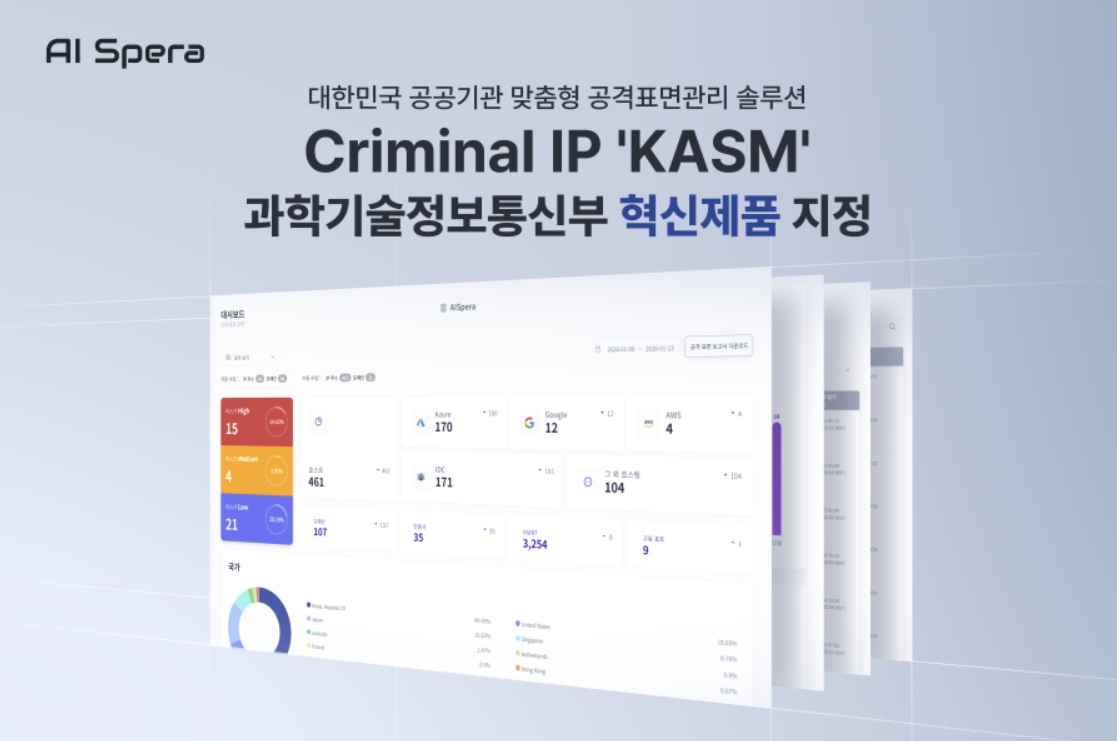 AI-based cybersecurity company AI Spera announced on the 15th that its public institution-specific attack surface management (ASM) platform 'Criminal IP KASM' was designated as an innovative product by the Ministry of Science and ICT.