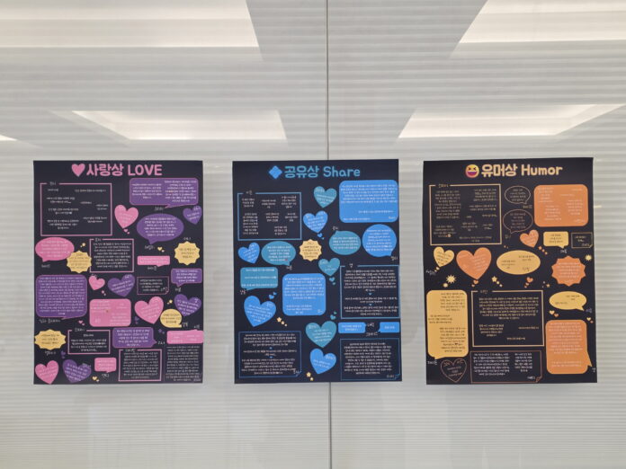Les valeurs fondamentales de Cheongyeon étaient bien présentes dans tout le bureau. Elles se reflétaient non seulement dans les noms des salles de réunion (« Salle de l'amour », « Salle du partage » et « Salle de l'humour », et l'entretien s'est déroulé dans la « Salle de l'humour »), mais aussi sur les visages de ses membres.