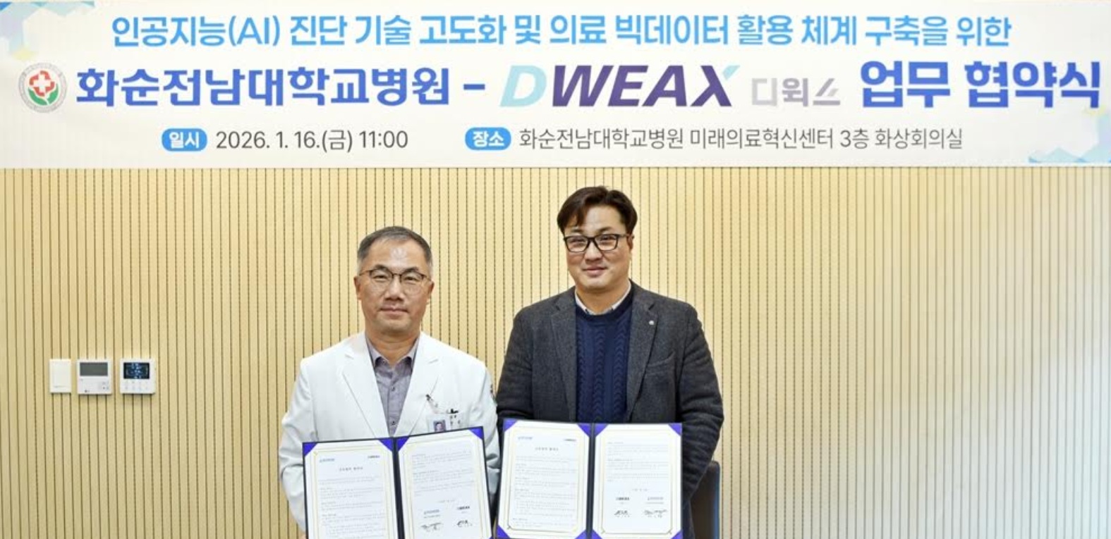 인공지능(AI)·데이터 전문기업 디윅스(DWEAX, 대표 안준형)는 최근 화순전남대학교병원(병원장 민정준)과 업무협약(MOU)을 체결하고, AI 기반 의료 진단 기술 고도화와 의료 빅데이터 활용을 위한 협력에 나선다고 19일 밝혔다.