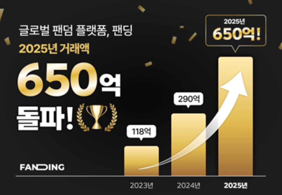 팬덤 비즈니스 전문 스타트업 주식회사 팬딩은 2025년 한 해 동안 연간 거래액 650억 원을 기록하며 크리에이터 이코노미 시장에서 성장세를 이어갔다고 19일 밝혔다. 누적 거래액은 1,250억 원으로, 2024년 거래액 290억 원 대비 2.24배 증가했다. 팬딩은 최근 4년 연속 연간 거래액이 두 배 이상 성장한 것으로 집계됐다.