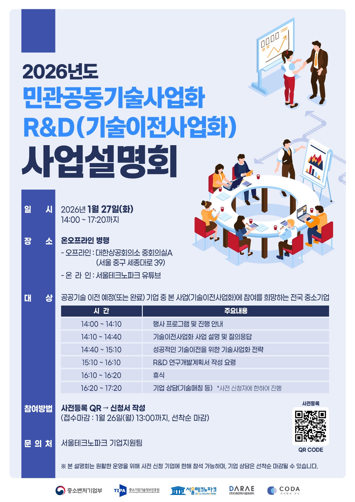 ソウルテクノパーク(院長ユン・ジョンウク)は1月27日、大韓商工会議所中会議室Aで2026年、民館共同技術事業化(R&D)技術移転事業化事業説明会を開催すると20日、明らかにした。今回の説明会は公共技術移転を計画中の本事業に参加を希望する全国中小企業を対象に設けられ、ソウルテクノパーク公式YouTubeチャンネルを通じてリアルタイム中継も進行される。
