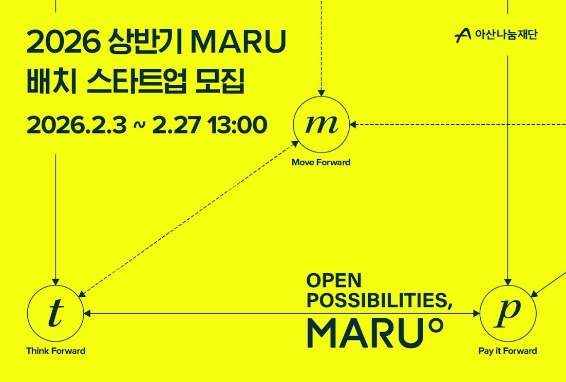 아산나눔재단은 기업가정신 플랫폼 ‘마루(MARU)’의 2026년 상반기 배치 프로그램에 참여할 스타트업을 2월 27일까지 모집한다고 3일 밝혔다.