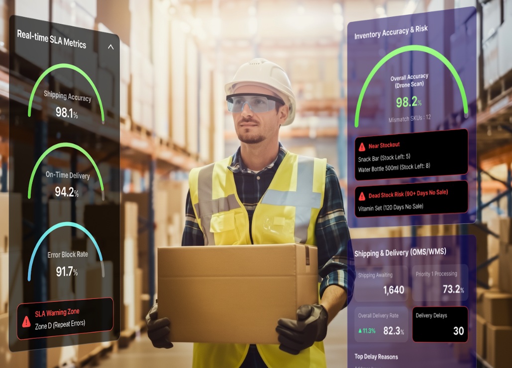 Dans le secteur de la logistique, les lunettes intelligentes permettront d'optimiser les trajets des opérateurs grâce à un guidage en temps réel et une assistance à la préparation de commandes. L'intelligence artificielle, basée sur l'apprentissage profond, reconnaît automatiquement les marchandises, les codes-barres et les textes. Le processus de détection en temps réel de l'état du chargement et des anomalies de volume de marchandises est conçu pour permettre une surveillance sur site.